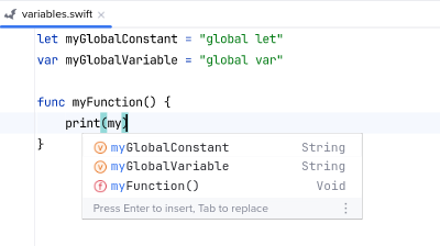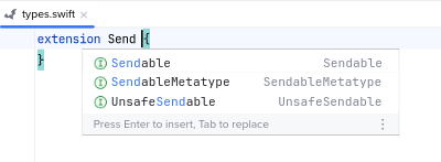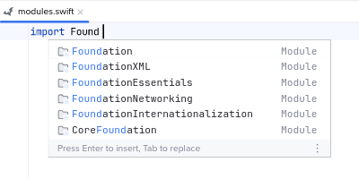 Swift Code Completion#Noctule’s code completion is based on SourceKit LSP, Apple’s official Swift language server.Suggestions are provided in most contexts of Swift code.Examples#Variables#Types#Modules#